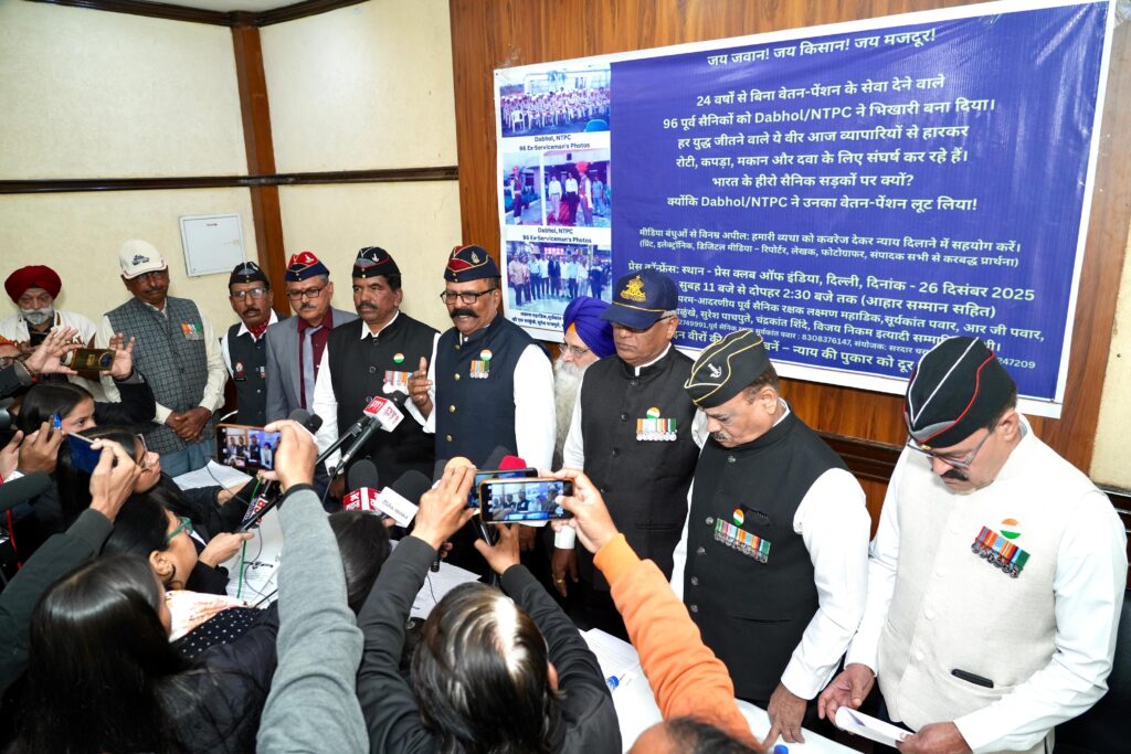 दाभोल/एनटीपीसी से जुड़े 96 पूर्व सैनिकों ने शुक्रवार को प्रेस क्लब ऑफ इंडिया में आयोजित प्रेस कॉन्फ्रेंस के दौरान 24 वर्षों से लंबित वेतन और पेंशन के मुद्दे पर सरकार और संबंधित संस्थानों के खिलाफ कड़ा रुख अपनाया। पूर्व सैनिकों ने साफ शब्दों में कहा कि अब और इंतजार नहीं किया जाएगा और यदि तत्काल कार्रवाई नहीं हुई तो वे अनिश्चितकालीन आंदोलन शुरू करेंगे।