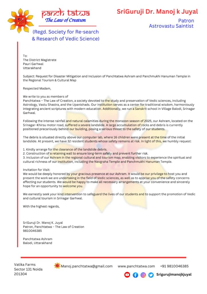 संस्था के संरक्षक श्रीगुरुजी डॉ. मनोज के. जुयाल ने जिलाधिकारी पौड़ी गढ़वाल को पत्र लिखकर स्थिति की गंभीरता से अवगत कराया है। उन्होंने बताया कि मलबा सीधे आश्रम के कंप्यूटर लैब के ऊपर स्थित है, जहां भूस्खलन के समय 16 बच्चे मौजूद थे। वर्तमान में आश्रम में 32 आवासीय छात्र रह रहे हैं, जिनकी सुरक्षा पर लगातार खतरा बना हुआ है।